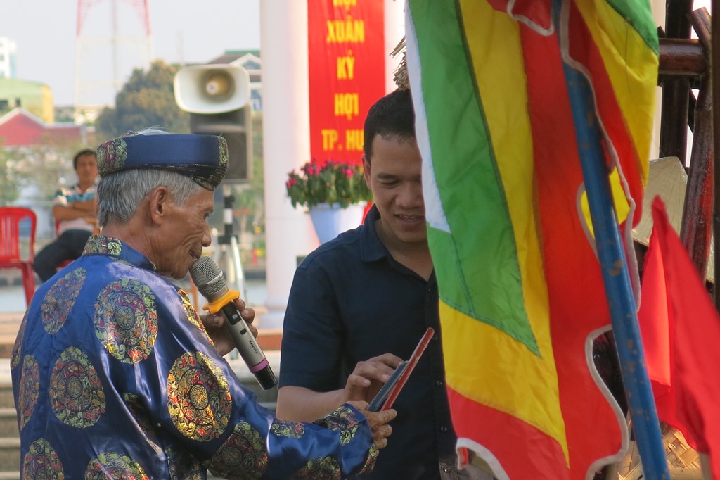 Năm nay, ông Trần Duy Chựa và bà Trần Thị Hoa quê ở Cầu ngói Thanh Toàn tiếp tục làm “ông hiệu, bà hiệu” dẫn xướng bài chòi. Những câu ca tương ứng với quân bài được ông Chựa hô rao, ứng tác đầy nhịp điệu khiến người chơi và cả người xem cười nắc nẻ: “Họ giàu họ ăn cơm trắng cá tươi. Còn tui đây cực khổ ăn cơm ruốc với mắm. Đêm năm canh tui nằm tui ngủ chèo queo, là eo… nghèo”. Hay: “Vai tui mang địu bạc lè kè. Tui lại nói khoáy, tui lại nói khéo mà họ nghe ầm ầm, ầm là ôn ầm”.