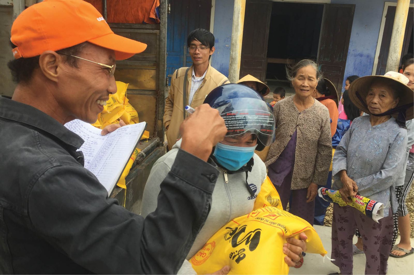 Ngày cuối tháng 10, chúng tôi chuyển 2 tấn gạo cho 4 thôn: Trung An, Đông Đỗ của xã Phú Hồ và Lê Xá Trung, Đông A của xã Phú Lương, huyện Phú Vang. Đường từ Huế về đến ngang đầu xã Thuỷ Thanh để về Phú Hồ vẫn còn ngập. Anh Chính, Trưởng thôn Trung An nghe điện thoại nói: “Các anh đứng đó, tui ra đón vô chừ”. Một lúc sau thì thấy anh chạy đến. Đường từ ngoài Thuỷ Thanh vào Phú Hồ khá xa. Nhiều đoạn ngập sâu. Phải nhờ anh Chính, đoàn mới vào đến với bà con Trung An được. Cũng như vậy mới biết người trưởng thôn này tận tình biết bao, và nhờ vậy đã giúp cho người dân nơi đây được nhiều.