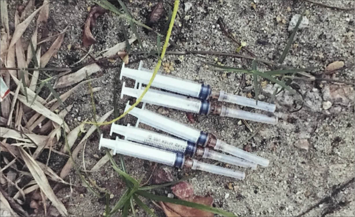 Kim tiêm vứt bừa bãi ngay bãi đất trống cạnh Trường THCS Tôn Thất Tùng. Ảnh: TL​