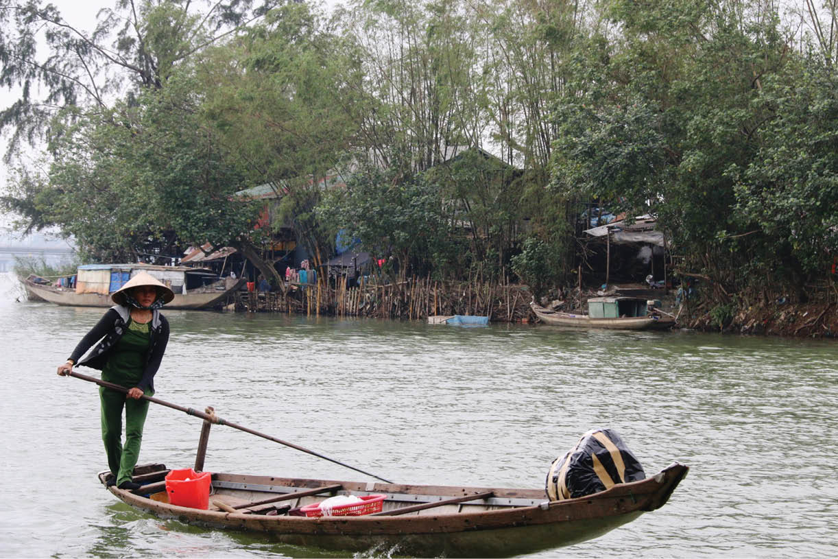 Đò cập bến, một cụ ông râu tóc đượm bạc tỏ ra bất ngờ: “Lâu rồi mới có người lạ tìm tới đây. Tưởng gần mà xa phải không mấy anh”. Ông là Võ Văn Vinh, 70 tuổi, người cao tuổi nhất ốc đảo này. Mời khách lạ ly trà ấm, ông dí dỏm và tự hào nơi mình sống, chỉ cần mở mắt là thấy bên kia những khu phố tráng lệ. Đúng như thế, liếc mắt có thể thấy những dãy phố, khách sạn nhộn nhịp trên đường Lê Lợi, rồi chợ Đông Ba sầm uất, thuyền rồng nối đuôi nhau chầm chậm trên sông Hương…