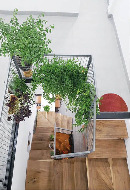 Giếng trời xanh mát với những chậu cây treo và bể cá xinh xắn
