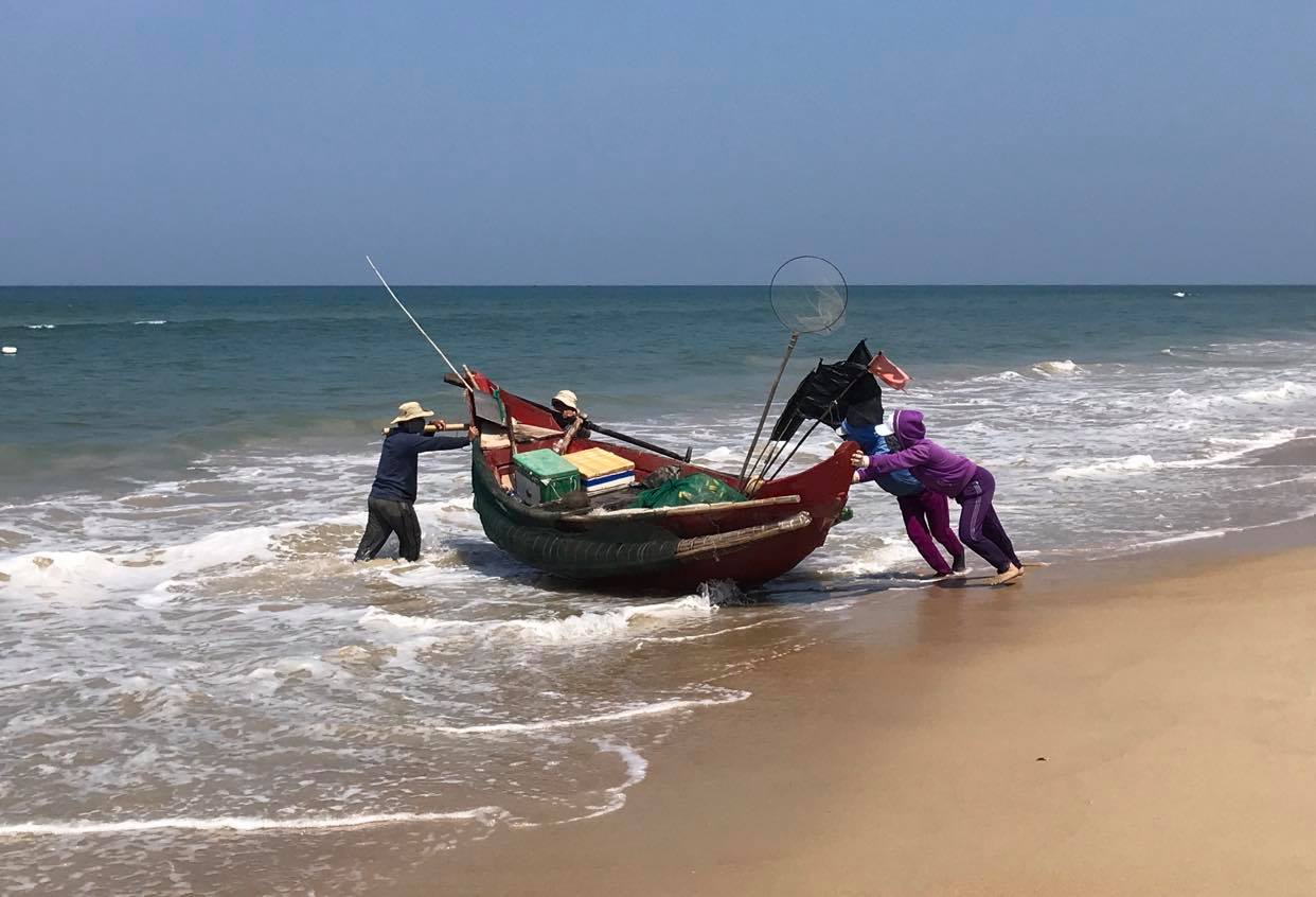 Rời biển Phú Diên, chúng tôi ghé bãi biển xã Vinh Xuân đúng lúc  thuyền đánh bắt tấp nập vào bờ. Theo người dân địa phương, buổi sáng, ngư dân bắt đầu ra biển đánh bắt, đến chiều thì trở về. Hải sản được đánh bắt trong ngày nên rất tươi ngon, thậm chí cá còn nhảy đành đạch.