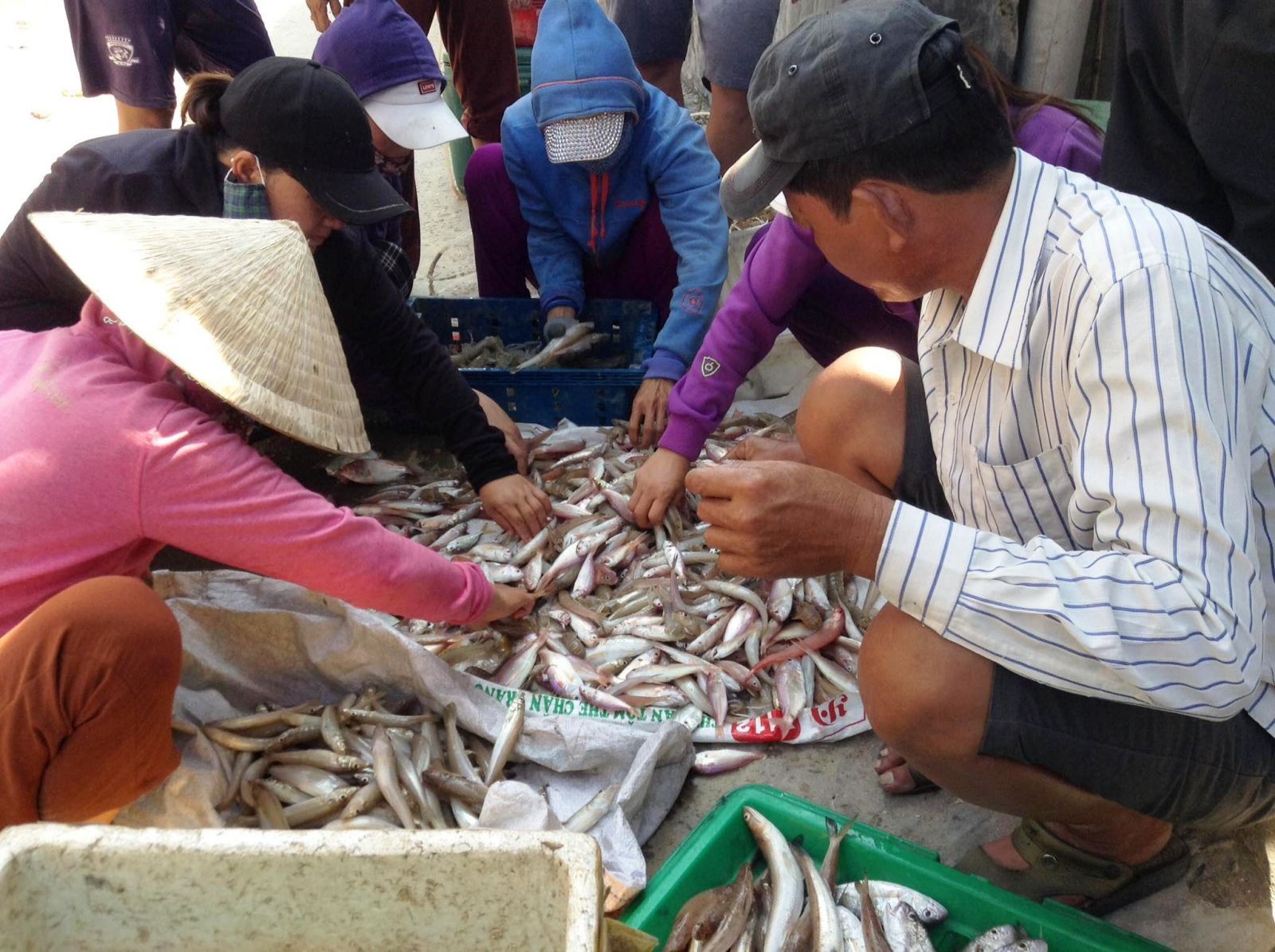 Thuyền của anh Kem (35 tuổi, thôn Mỹ Khánh, xã Phú Diên) vừa mới vào bờ thì tiểu thương đã chờ sẵn để cân cá. Những con cá má, cá đục tươi, mắt còn óng ánh được người mua phân loại, đem cân. Mặc dù tiểu thương đã cân cá xong xuôi nhưng thấy chúng tôi có vẻ thích mua, anh Kem, chủ thuyền vui vẻ: "Mấy em mua thì để chị Ngân (tên của một tiểu thương) bớt lại cho, mấy khi gặp cá tươi ngon mà lại giá tận xuồng thế này"!