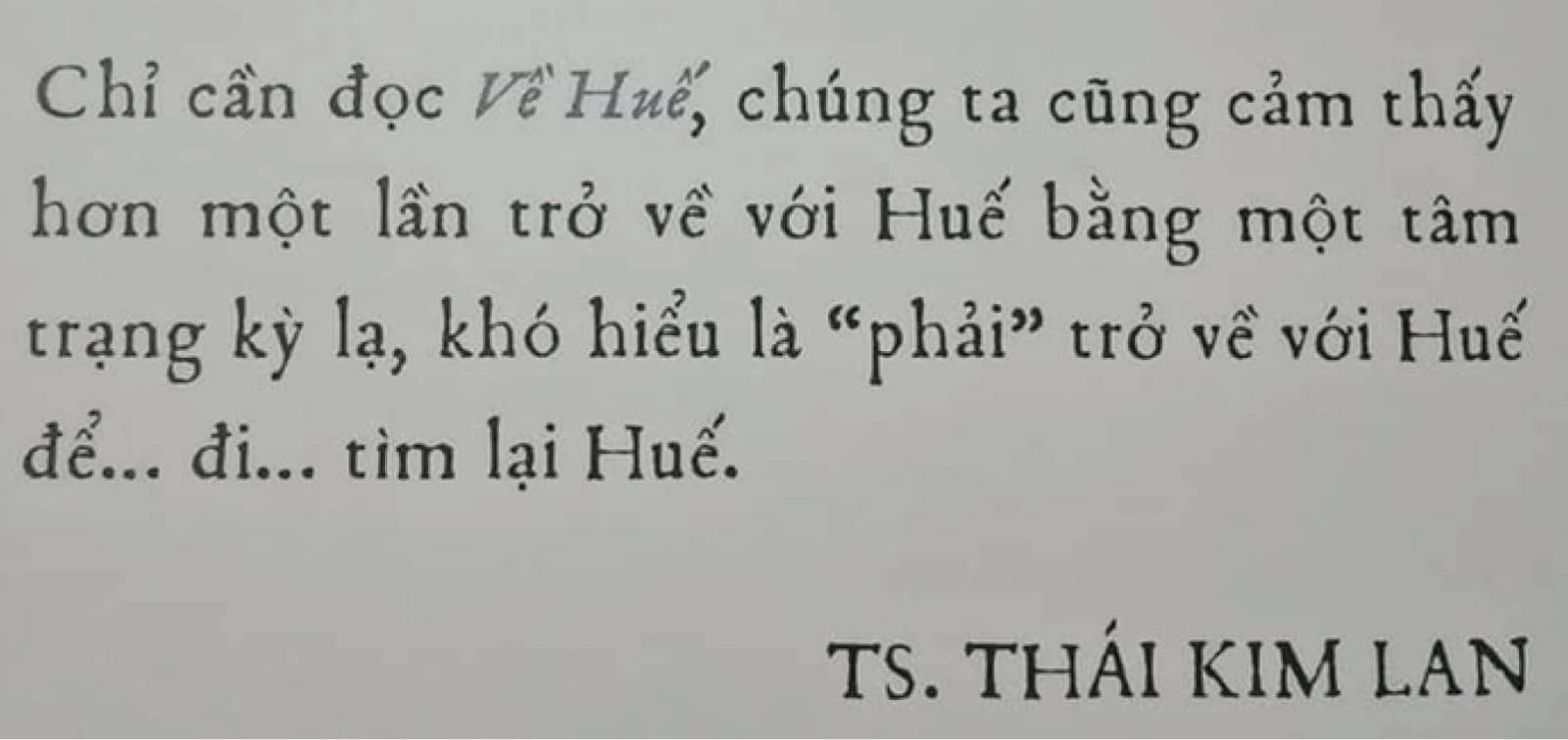 Riêng mình, tôi đã đọc “Về Huế” một lần, hai lần và có lẽ nhiều lần nữa. Đọc để thấy Huế thêm thương và rất lạ. “Thấy hơn một lần trở về với Huế bằng tâm trạng kỳ lạ, khó hiểu là phải trở về với Huế để đi tìm lại Huế” (TS.Thái Kim Lan).