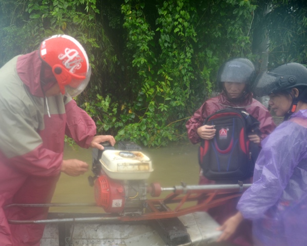 Chiếc đò máy “lao động” cật lực, trong thời điểm gió càng rít, mưa càng nặng hạt, tiếng máy tự nhiên lịm dần, rồi tắt hẳn. Nhanh nhẹn xuống nước cùng thôn đội Phan Quốc Ngân, lúi húi một hồi, chị Vy phấn khởi: “Tiếp tục lên đường thôi mấy anh”.