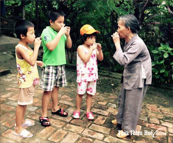 Người già ở Phước Tích hướng dẫn con cháu thổi tu huýt