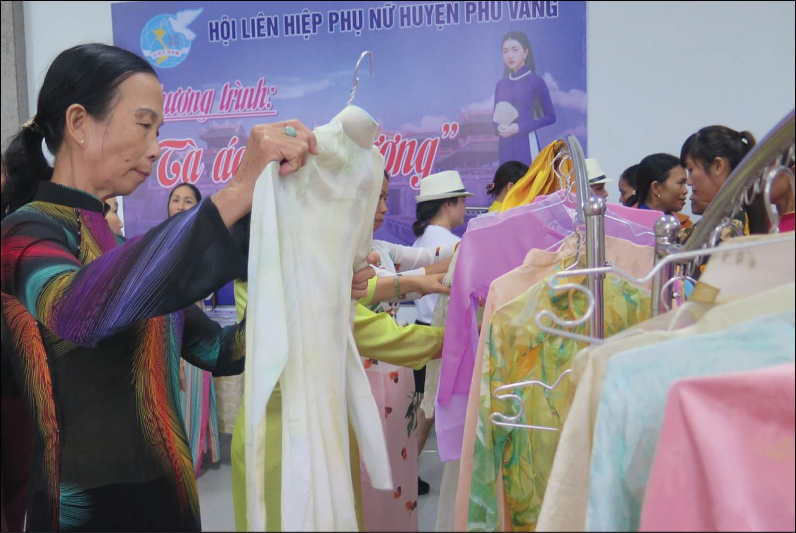 Các chị tham gia lựa chọn áo dài tại gian hàng "Tà áo yêu thương" do Hội LHPN huyện Phú Vang tổ chức