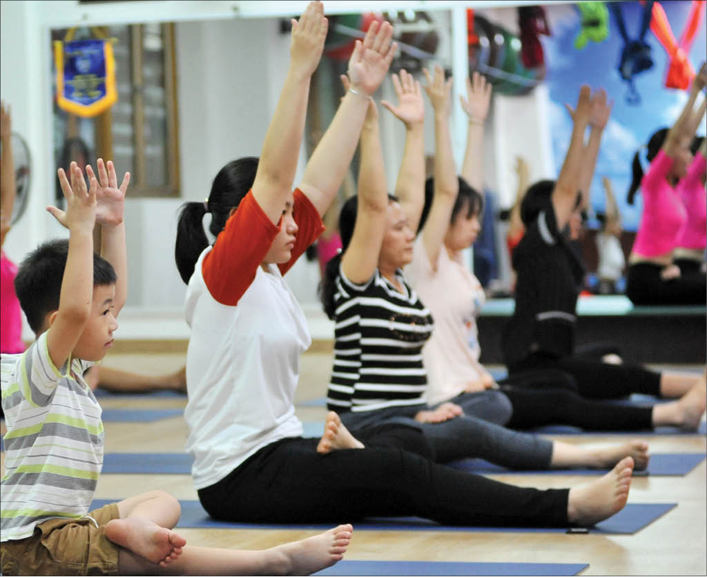 Trẻ theo mẹ tập yoga ở Trung tâm TDTT tỉnh