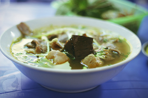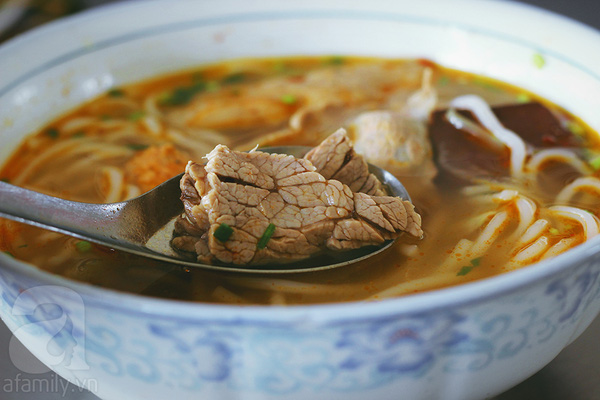 Bát bún ở đây khá đầy đặn bao gồm thịt bò, tiết hay giò heo đều được thái miếng to. Các viên thịt bò và lợn ăn giòn, chắc nhưng sợi bún lại nhỏ hơn sợi bún Huế chuẩn một chút. Bù lại nước dùng ở đây khá chuẩn vị vừa đậm đà vị mắm ruốc, vừa thơm mùi sả. Khi ăn, chỉ cần cho thêm vài giọt chanh chua chua và một chút ớt xào là bát bún đã đủ sức hấp dẫn bất kỳ ai, ngay cả giữa mùa hè nóng bức.