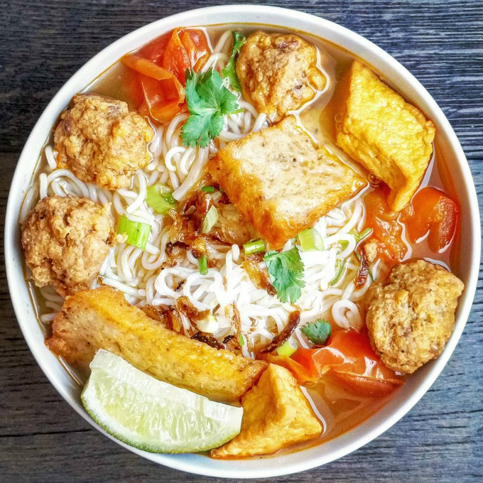 Tô bún riêu đầy ắp với chả cua, đậu, riêu cua, bò viên cùng miếng cà chua đỏ hấp dẫn.