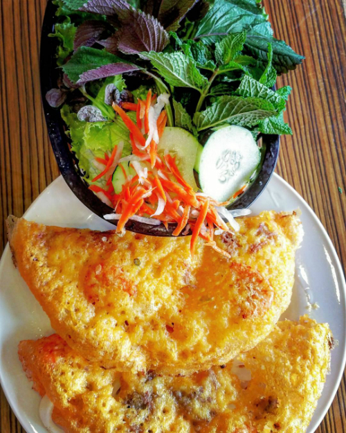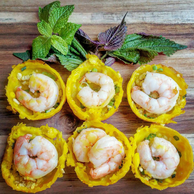 Bánh khọt vàng ươm, bên trong thay vì nhân tôm nguyên vỏ như ở Việt Nam, đầu bếp Việt kiều sử dụng tôm to bóc vỏ.