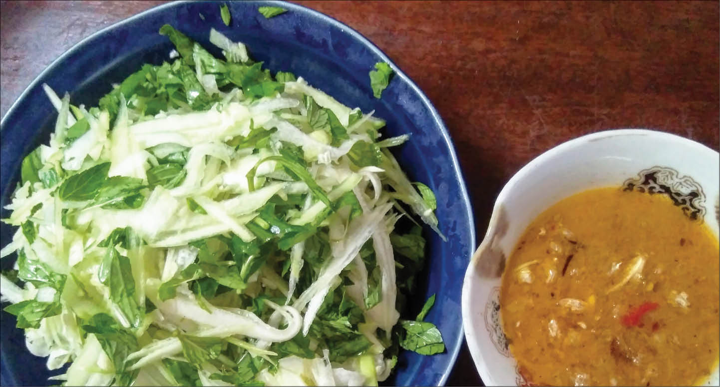 Tiếp đó, rửa cái rau thơm, ra vườn hái mấy lá ngò gai vào rửa sạch, xắt mịn, rồi trộn vào trong dĩa dưa đã bằm để đến khi ăn sẽ thơm và nhiều mùi hơn.