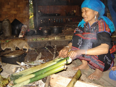 Cứ mỗi độ Tết đến, người Kơ tu Nam Đông lại quây quần bên bếp lửa hồng để nướng món cơm lam, xôi lam. Đây là món ăn truyền thống được đồng bào nấu để ăn và đãi khách trong dịp Tết. Cơm lam, cơm nếp lam là hai món ăn được bà con ưa thích bởi gạo tẻ, hoặc gạo nếp được nấu trong ống nứa, tre lồ ô. Tre, nứa được chọn là những loại tươi, còn xanh non. Loại gạo, nếp được chọn làm bánh phải tự tay bà con làm ra mới có vị thơm ngon đặc trưng... Trước khi nướng, bà con ngâm nếp, gạo mềm, sau đó cho vào ống, lấy lá chuối nút lại và đặt trên bếp. Mang ra đãi khánh, các ống cơm lam được chẻ bỏ bớt phần cật ống nứa, chỉ để lại phần lõi bên trong. Người ăn có thể cầm cả ống cơm lam, tách phần nứa còn lại để lấy cơm ăn, hoặc chủ nhà có thể cắt thành từng khúc để mời khách. Thường khi ăn cơm lam, khách tự bóc sẽ thú vị hơn. Người bóc làm sao giữ được lớp vỏ lụa trắng mỏng manh của ruột cây nứa thì mới cảm nhận hết chất thơm ngon, dẻo ngọt của món cơm, xôi lam truyền thống.