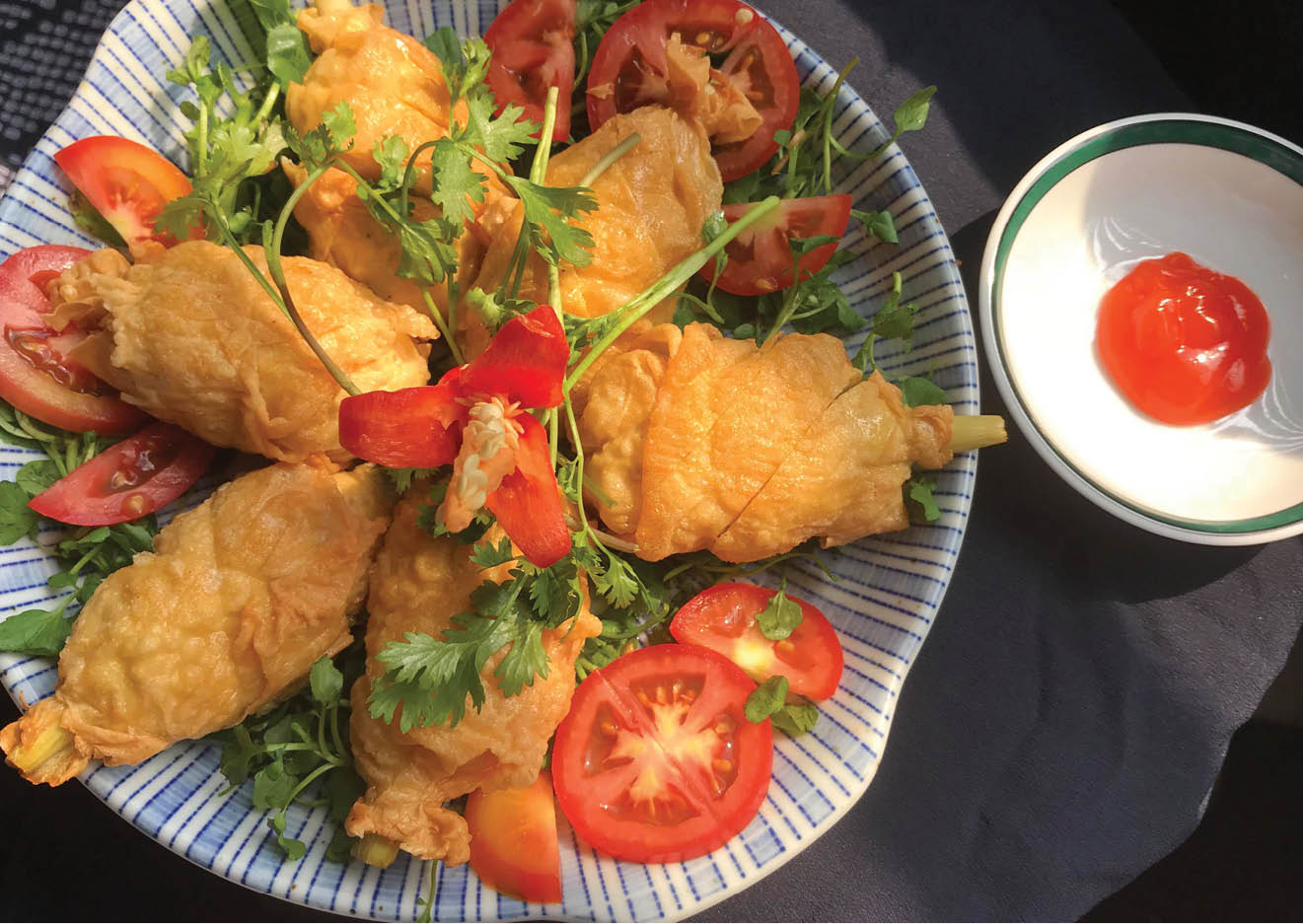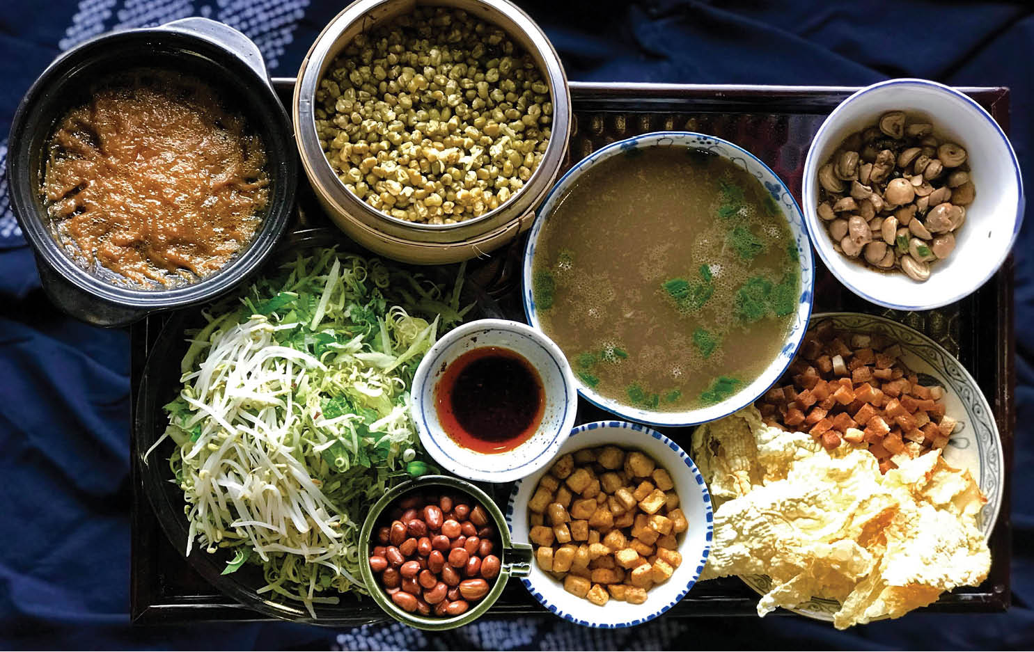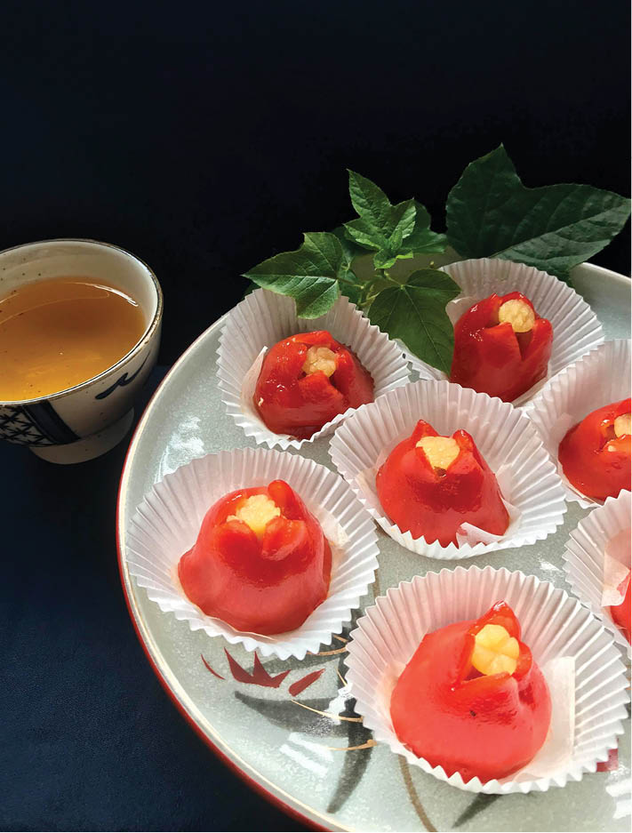 Mỗi dịp Tết đến, nghệ nhân ẩm thực Mai Thị Trà thường vào bếp nấu món chay để dâng cúng tổ tiên. Súp, gỏi thập cẩm, phở khô, chả quật, các loại bánh lá, bột lọc, ít đen… là những món bà thường bày biện. Bắt mắt nhất là món gỏi thập cẩm với đầy đủ màu sắc: Đỏ của cà rốt, tím của bắp su, xanh của dưa leo, đen của nấm mèo, điểm tô thêm bông hoa từ quả ớt, cà chua trông thật rực rỡ! Cầu kỳ hơn, bà Trà còn làm chả quất. Khuôn đậu sau khi giã mịn, nêm gia vị, bà vo tròn nặn thành hình trái quất, hấp chín, nhuộm màu. Những “trái quất” được treo lủng lẳng trên cành là một biến tấu thú vị trong cách trang trí món chay này.