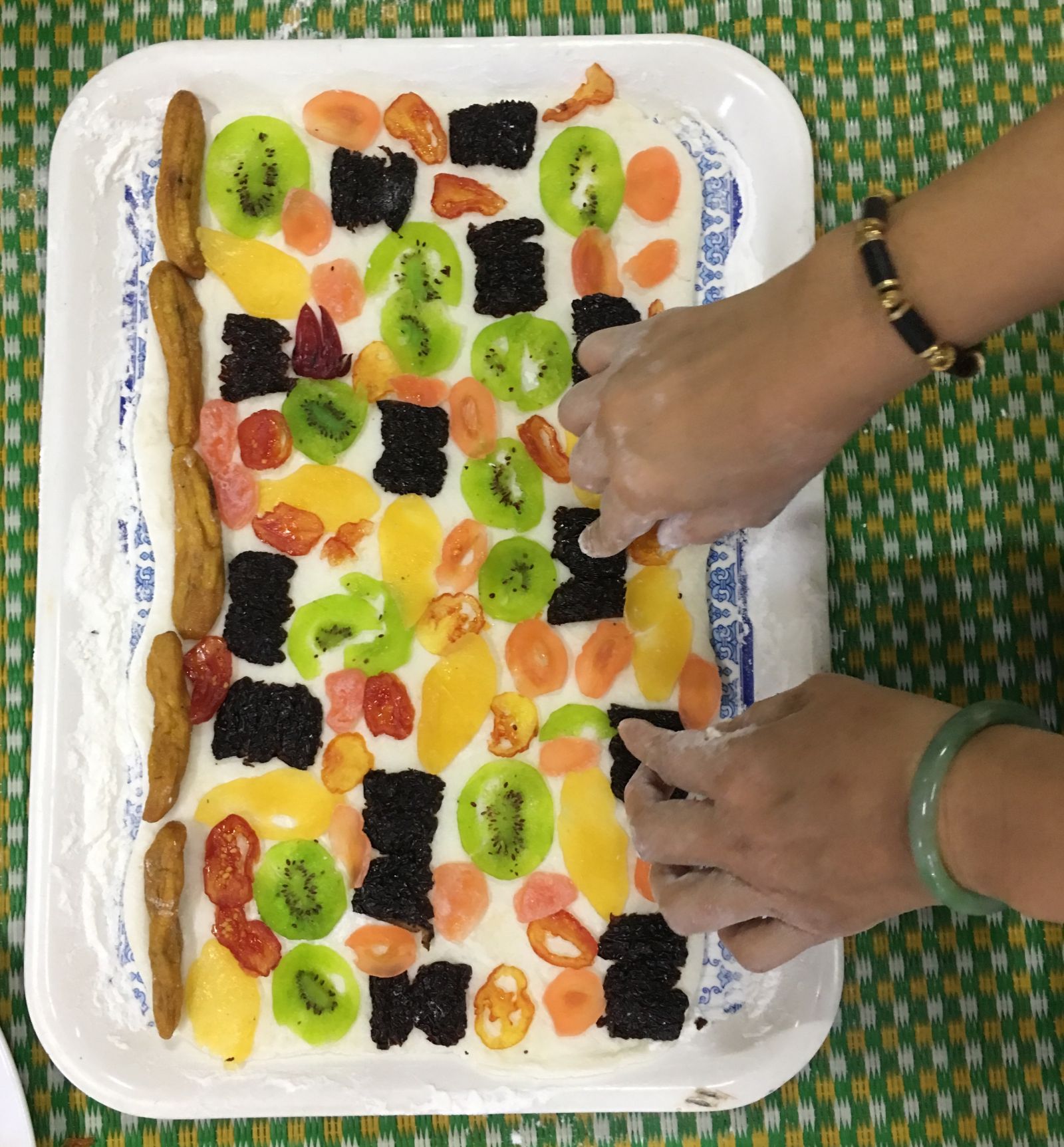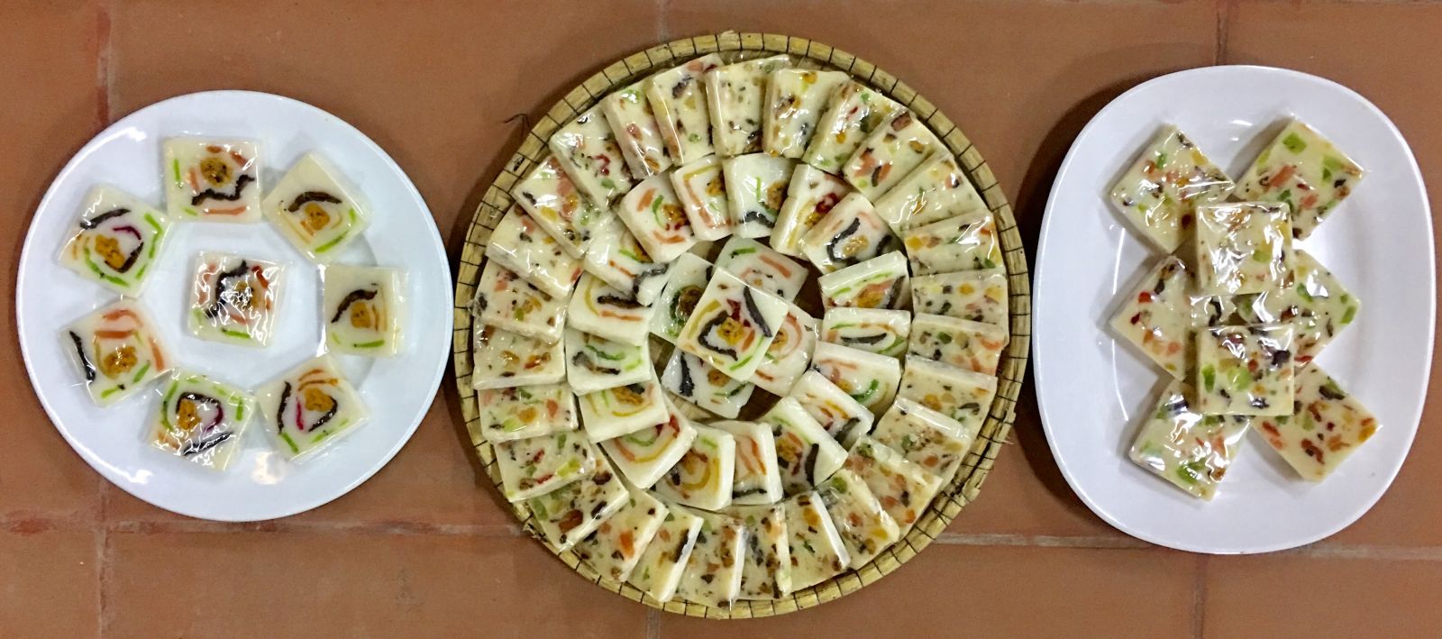 Bột nếp sau khi được nhồi dẻo sẽ cán mỏng vừa phải trên khay hoặc mâm. Hỗn hợp mứt sắp lệch màu để khi cắt ra, lát bánh có màu hài hòa. Tôi phụ mệ cuốn bánh đều tay. Bánh được lăn tròn, dùng màng bọc thức ăn bọc lại trong vòng 24 tiếng để bột và nhân quện lại. Hôm sau, chỉ việc dùng cây dao không rỉ, kê bánh cắt bề dày khoảng chừng một phân, lấy giấy kính gói bốn mép lại là xong. Mệ dặn dò: “Khâu cuốn bánh phải khéo, đều tay thì bánh chặt. Sau đó dùng thước gỗ để tạo góc bánh vuông vức, bốn cạnh đều hay không ăn thua ở người làm. Thời mới học từ các dì, mệ toàn mần không đều cạnh, sau vài lần mới có kinh nghiệm”!