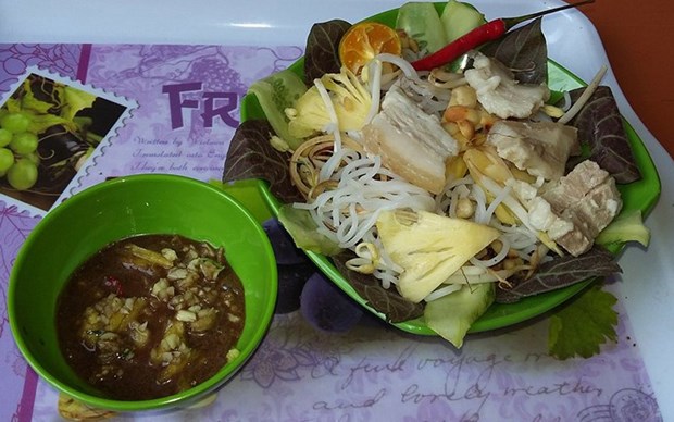 Tôi gọi hai tô bún mắm nêm, cô chủ quán mau mắn lướt tay một lát trên quầy hàng rồi bày ra hai tô bún nhỏ xinh, một chén mắm nêm đầy ắp, thêm dĩa rau sống xanh mơn mởn nào hoa chuối thái mỏng tanh, xà lách non, rau thơm, rau mùi, giá đỗ… Tô bún có ba lớp: lớp dưới cùng lót đủ loại rau sống, lớp thứ hai là bún sợi mềm thơm, lớp thứ ba là những lát thịt thủ thái mỏng, thịt hồng hồng, mỡ trắng mỏng như lá lúa, lẫn vài lát thịt tai heo giòn giòn. Công sắp xếp của người bán đến vậy, còn việc chan mắm nêm là của thực khách. Mùi thơm từ chén mắm đỏ au hấp dẫn quá nên tôi tham lam múc hẳn một thìa to, đến khi ăn thử một miếng mới hối hận thì đã muộn.