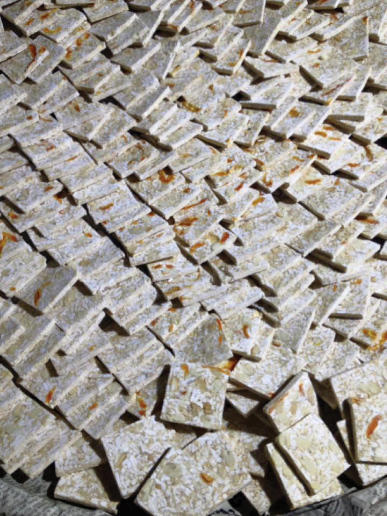 Những hột nếp được rang cho chín nổ bung ra rồi trộn với đường, đậu phụng, gừng và một số thứ gia vị đồng quê khác rồi đưa vào cái hộc hình trụ được đóng ghép bằng gỗ tốt và bắt đầu dùng cái chày để đóng bánh. Nếu như các thứ nguyên liệu đều được người phụ nữ trong nhà chuẩn bị thì người đóng bánh phải là cánh đàn ông với đôi tay khỏe bánh mới chắc, mới ngon...