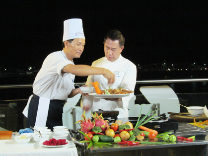 Siêu đầu bếp Martin Yan thực hiện món ăn cùng bếp trưởng Lê Hồng Sơn tại nhà hàng nổi sông Hương