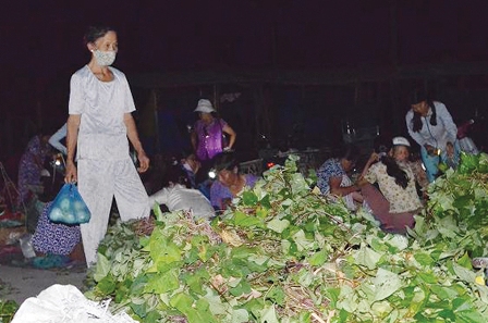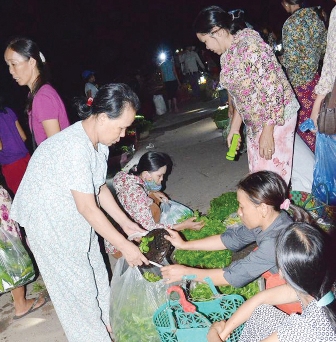Mỗi sớm, bác Hiền (người cầm túi ni lông) đều đến chợ lấy rau thơm lên bán ở chợ Thuận An