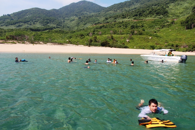 Du khách tắm biển ở khu vực bãi hòn Chuối, nằm dưới chân Hải Vân, cách biển Lăng Cô tầm 15 phút di chuyển bằng canô