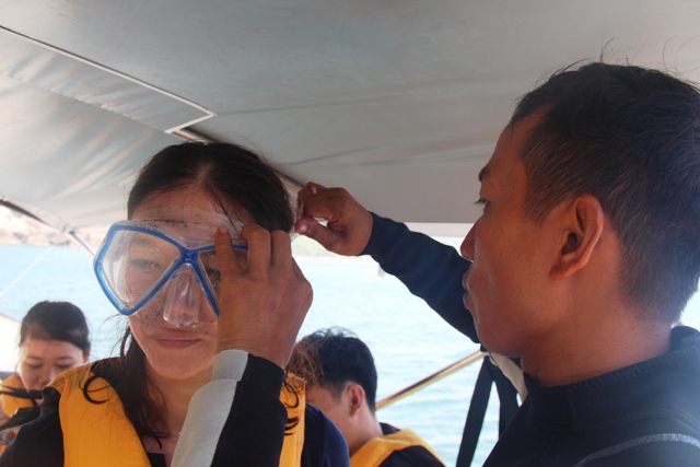 Sau chừng 20 phút, canô tiếp tục di chuyển đưa đoàn khách ra xa hơn rồi tấp vào một bãi đá gần bờ để lặn ngắm san hô. Trước đó, ngay khi còn ở trên ca nô, anh Trần Quốc Hưng, ông chủ tour còn khá mới lạ này hướng dẫn cho từng hành khách sử dụng các trang bị như một thợ lặn chuyên nghiệp như quần áo lặn, kính mắt, ống thở, bình hơi… và các kĩ năng hít thở, ngắm san hô ở độ sâu 6-10 mét.