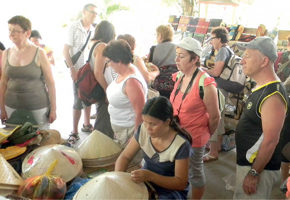 Khách du lịch quốc tế thích thú xem các thiếu nữ Huế thao diễn nghề chằm nón tại Khu làng nghề đường Huyền Trân Công Chúa
