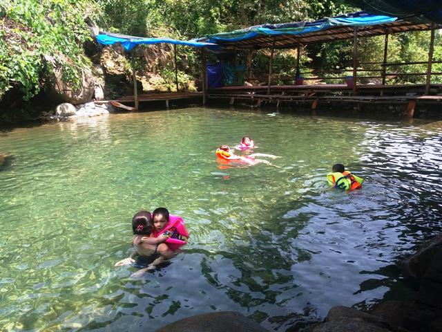 Lên phía đầu nguồn sẽ nhìn thấy một tảng đá lớn, giữa các kẽ đá là dòng nước chảy như mái tóc thiếu nữ trắng xoá tạo thêm khung cảnh càng lung linh, tráng lệ, thoả sức để du khách có thể trượt hay vui đùa cùng bạn bè. Phía dưới có 3 vũng nước, biệt lập, mỗi vũng rộng chừng 100m2, dù không quá sâu nhưng cũng đủ để cho du khách thoả thích bơi lội. Theo người dân địa phương, vì ở đây vừa có suối, vừa có thác tạo nên dòng chảy đổ ra đầm Lập An nên người dân gọi suối Thác Đổ.