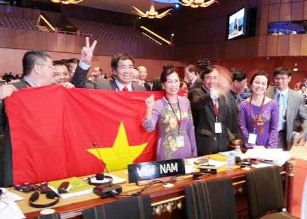 Niềm vui của đoàn Việt Nam khi Quần thể danh thắng Tràng An được ghi tên vào danh mục DSG. Ảnh: CTV