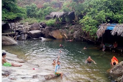 Các món ăn được phục vụ ở đây cũng đơn giản và gần gũi như cá trê, ếch, gà, kỳ nhông; một vài dịch vụ thiết yếu khác như cho thuê áo quần tắm, áo phao, phao bơi… Du khách khi đến đây có thể tắm ở các hồ bên dưới hoặc ngược lên đầu nguồn, thoả thích tìm hiểu thiên nhiên và tự do ngâm mình trong dòng nước mát để tận hưởng cảm giác thư thái, thoải mái, dễ chịu.
