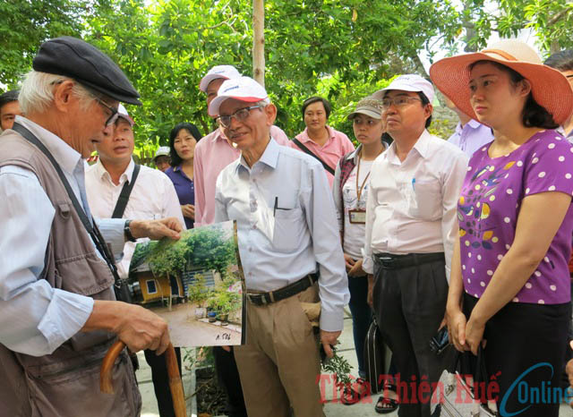 Ông Nguyễn Đắc Xuân (đội mũ đen) đưa các nhà nghiên cứu đi khảo sát thực địa tại chùa Thuyền Lâm. Ảnh: Minh Hiền