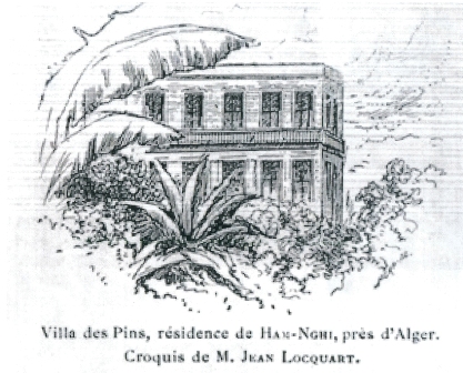 "Biệt thự Ngàn Thông - nơi cư trú của vua Hàm Nghi – tù nhân của Pháp - tranh của ông Vuillier vẽ theo phác thảo của ông Jean Locquart"
