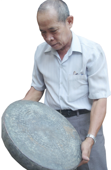 Nghệ nhân Nguyễn Văn Sính đang giới thiệu một chiếc phèng la cổ thường được sử dụng trong dàn nhạc cung đình triều Nguyễn