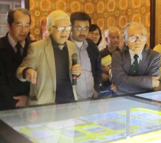 Nhà nghiên cứu Nguyễn Đắc Xuân thuyết minh về tài liệu trưng bày.