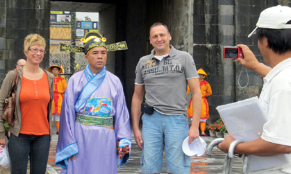 | Du khách chụp ảnh lưu niệm với “quan văn” |