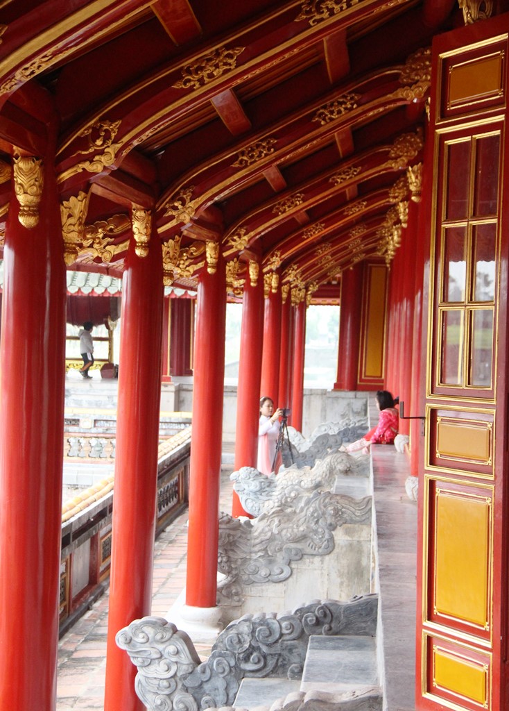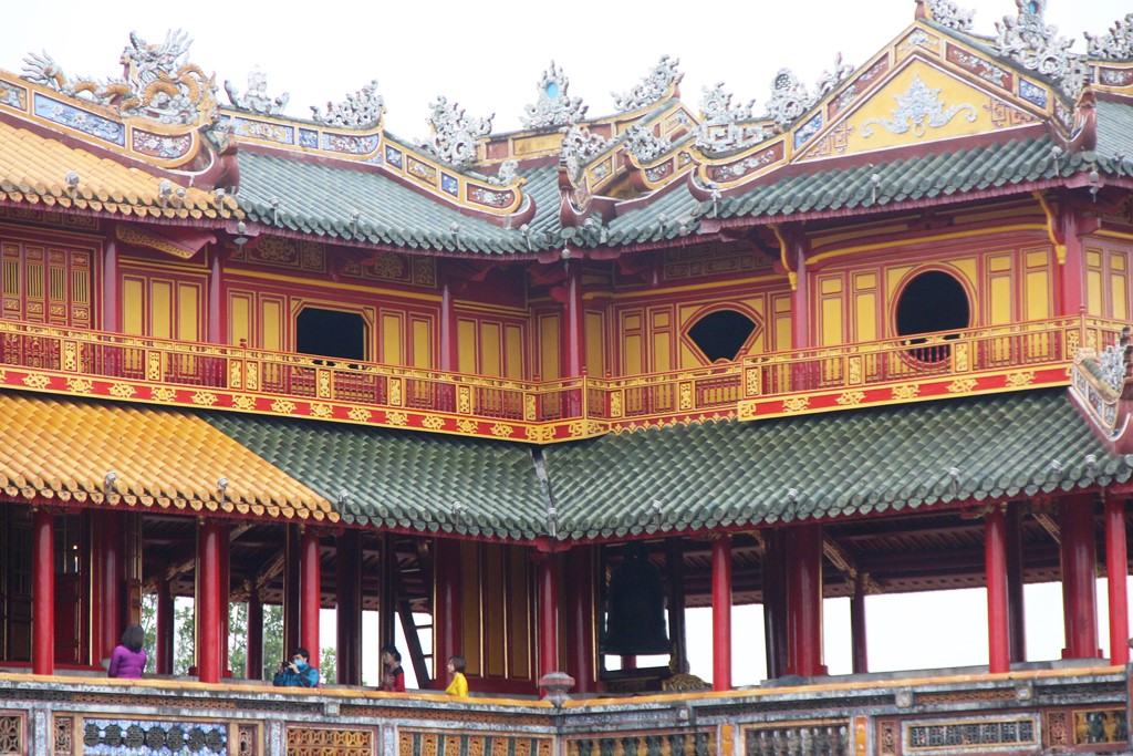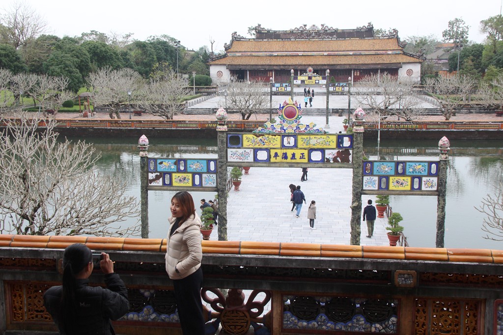 Du khách chụp ảnh trên lầu Ngũ Phụng, hướng nhìn về điện Thái Hoà