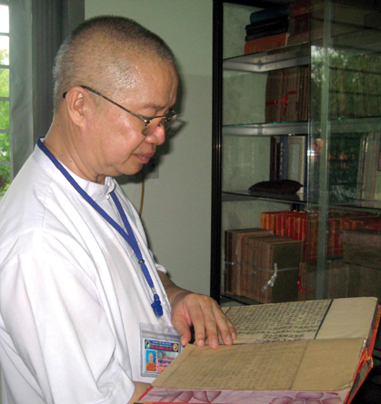 Hòa thượng Thích Tuệ Tâm nghiên cứu những bộ sách quý vừa được tặng