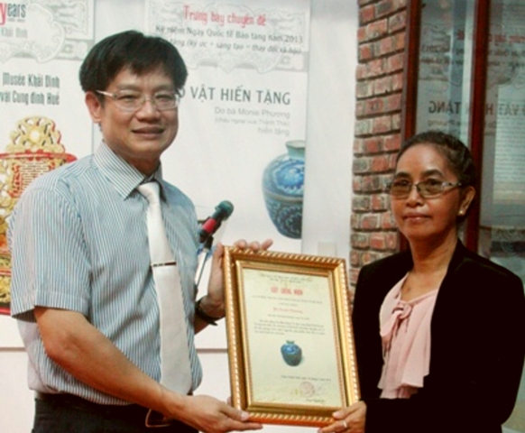 Bà Phương Monie nhận giấy chứng nhận hiến tặng cổ vật của Trung tâm Bảo tồn di tích Cố đô Huế. Ảnh: Hải Trung