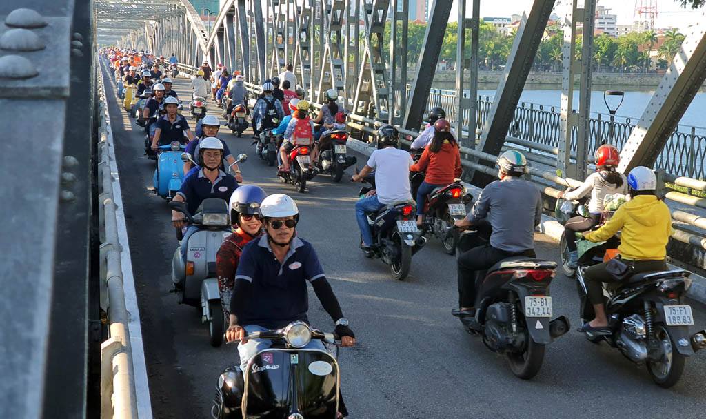 Trên hai dòng xe máy cổ (Vespa và Honda 67) được sử dụng trong hai bộ phim đóng gần đây ở Huế là “Mắt Biếc” và “Gái già lắm chiêu 3”, đoàn diễu hành khởi hành từ Khách sạn Azerai La Residence đến cầu Trường Tiền, qua chợ Đông Ba, đến Phố cổ Bao Vinh và dừng ở quán cà phê Mắt Biếc để chụp hình, tham quan. Sau đó, đoàn di chuyển qua các tuyến phố Nguyễn Trãi, Lê Duẩn để lên Kim Long, dừng ở Nhà vườn An Hiên để chụp ảnh và trải nghiệm các dịch vụ ở đây.