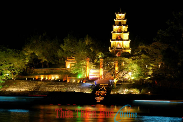 Chùa Thiên Mụ lung linh khi được chiếu sáng vào ban đêm
