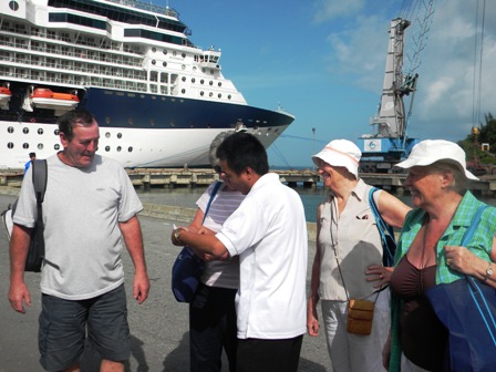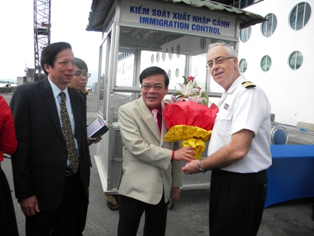 | Đồng chí Ngô Hòa trao hoa chúc mừng thuyền trưởng tàu Celebrity Millennium |