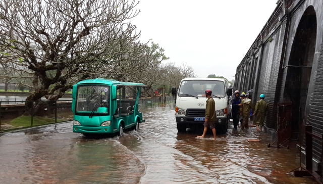 Tại khu vực phía sau cửa Ngọ Môn, do nước vẫn còn ngập khoảng 20-30cm, Trung tâm BTDTCĐ Huế đã huy động xe điện để vận chuyển du khách qua những chỗ ngập lụt, đồng thời đặt tạm thời một lối gạch Bát Tràng để giúp cho khách tham quan đi lại an toàn.