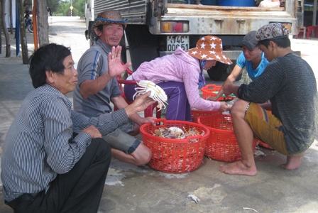 | Các chủ quán ở bãi tắm Vinh Thanh đang thu mua hải sản tươi sống |