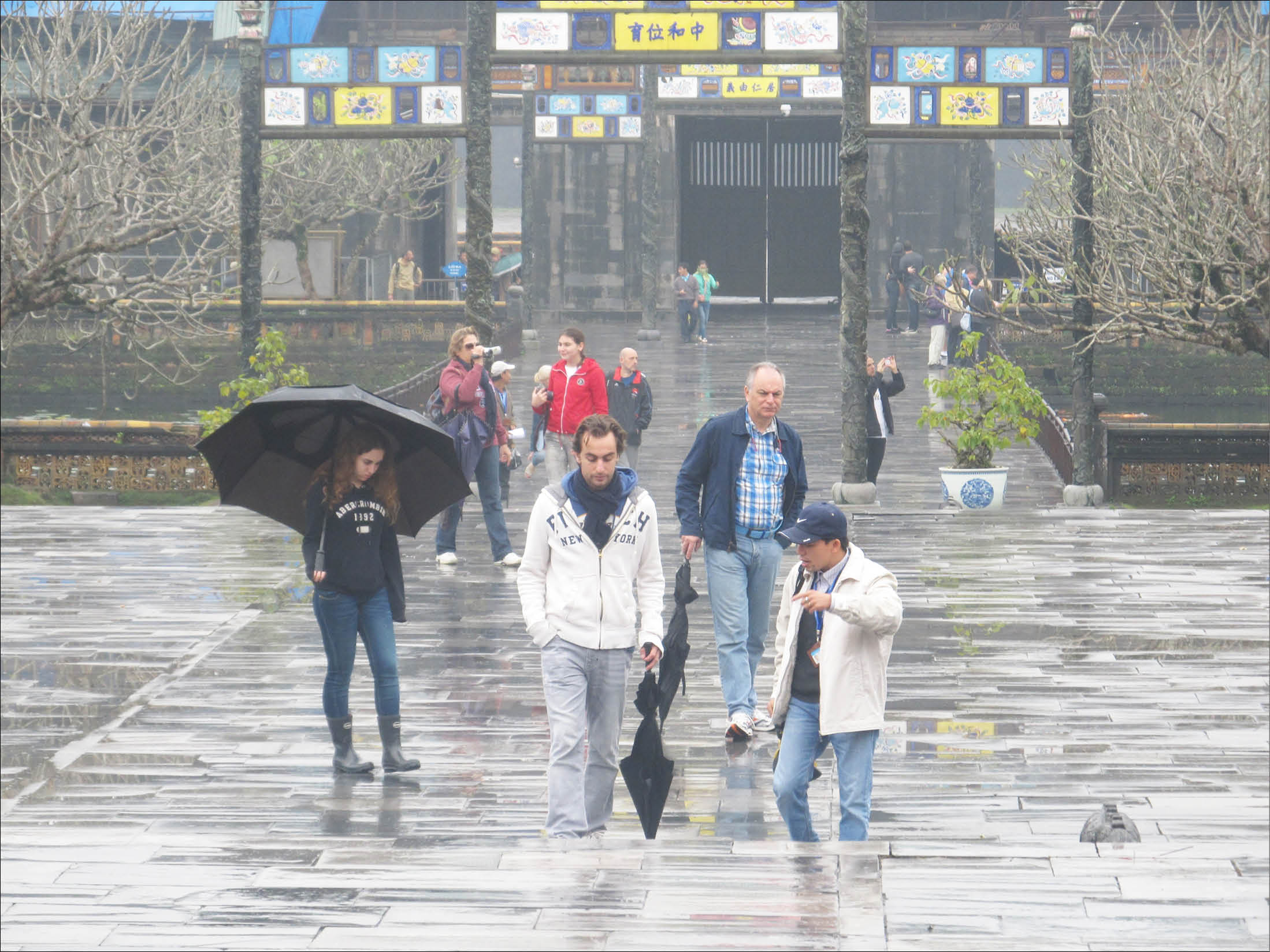 Vào thăm Đại Nội đầu giờ sáng, mưa phùn giăng mờ cả một không gian rộng lớn càng tôn thêm vẻ cổ kính của di tích cung điện, đền đài. Từ Duyệt Thị Đường, Trường Lang, qua Tả - Hữu Vu, điện Thái Hòa… không điểm nào thưa vắng du khách. Trên dấu tích của nền móng điện Kiến Trung, một đoàn khách du lịch nội địa khoảng 50 người đang đứng quanh hướng dẫn viên du lịch của hãng Vietravel và chăm chú nghe giới thiệu. Đó là đoàn khách Việt đông nhất mà tôi gặp trong buổi sáng mưa lạnh của Huế. Còn lại, chủ yếu là khách ngoại quốc đến từ các nước châu Âu, Nhật Bản hoặc Hàn Quốc…