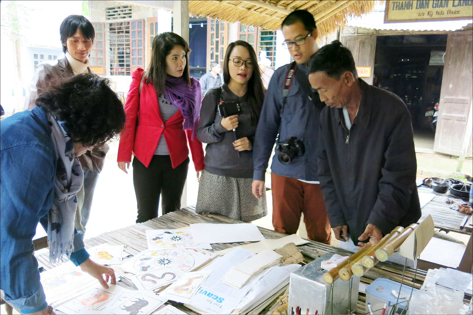 Cập bến đò làng Sình, chúng tôi vào nhà nghệ nhân Kỳ Hữu Phước tham quan dòng tranh dân gian nức tiếng tồn tại hơn 300 năm. Mới buổi sáng mà nhà nghệ nhân đã tấp nập khách. Ai cũng hí hửng hòa màu, in cho mình bức tranh mang về làm kỷ niệm.