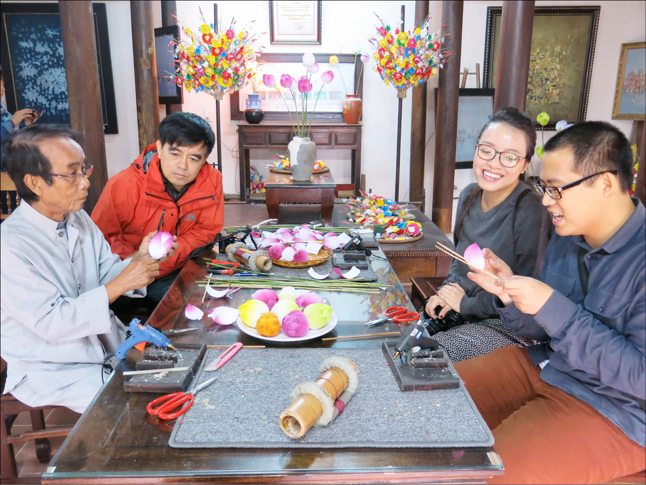 Nghệ nhân Thân Văn Huy (đầu tiên bên trái) hướng dẫn làm hoa sen giấy