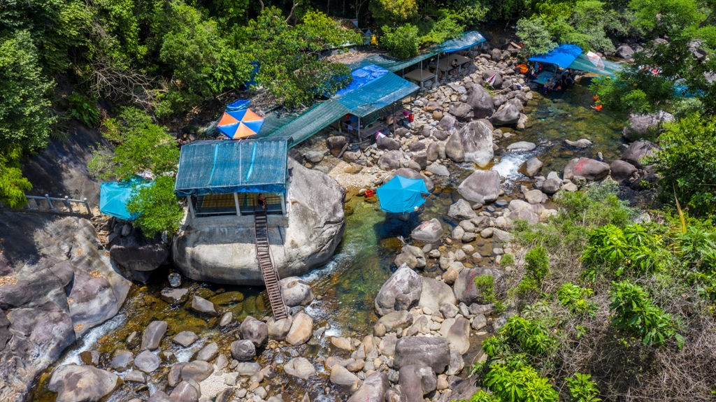 Những mái chòi “dã chiến” được dựng lên để đón du khách. Theo kinh nghiệm, càng đi sâu, lên cao nước càng sạch, dòng nước mạnh vừa đủ, cực mát