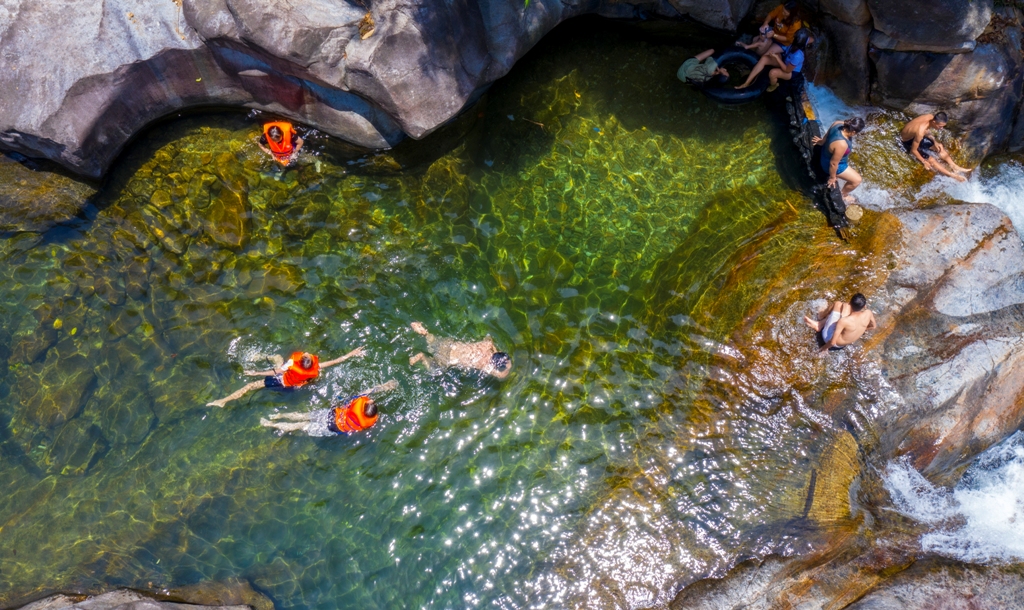 Nhiều du khách thỏa thích tắm mát ở suối Tiên. Tự nhiên đã tạo hóa và ban tặng cho suối Tiên những vụng nước trong lành ít nơi nào có được
