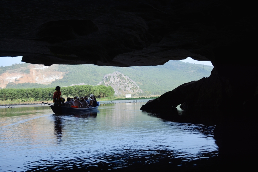Mải ngắm cảnh, trước mắt đã hiện ra cửa hang khá rộng. Thuyền đưa khách theo dòng nước chui vào lòng núi. Theo giới thiệu, đây là động Kim Sơn (động nước), một trong 7 hang động rộng và đẹp của khu thắng tích. Không khí trong hang mát lạnh hơi đá, thuyền chậm chậm trôi để khách có thể thong thả nhìn ngắm các nhũ đá được hình thành sau hàng triệu năm với muôn loại hình thù cho khách thả sức tưởng tượng ra các hình thù chim, thú, trống, chuông….tùy theo góc nhìn và cảm nhận của mình. Chừng hơn 50m thì thuyền đến cửa hang thông sang phía bên kia núi. Hang rộng và kín đáo, nên thời kháng chiến chống Pháp và chiến tranh chống Mỹ, nơi đây đã được dùng làm nơi trú quân, cất giữ vũ khí của ta.