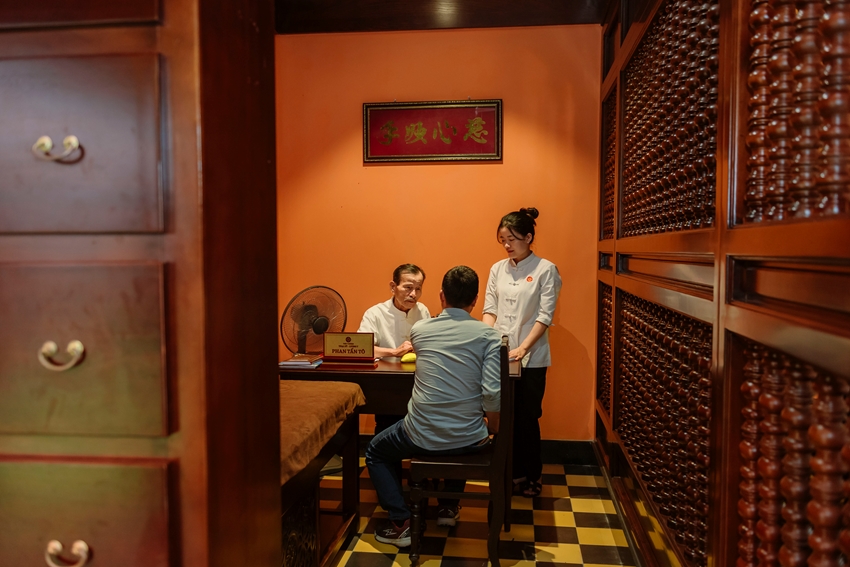 | Lương y Phan Tấn Tô bắt mạch cho khách ở Đại Nam Thái Y Viện |