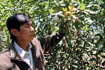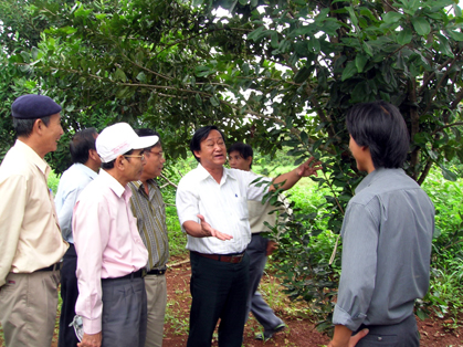 TS. Nguyễn Lân Hùng trao đổi với nông dân Dak Lak về cây Macadamia Ảnh: Nguyễn Lê Hoa